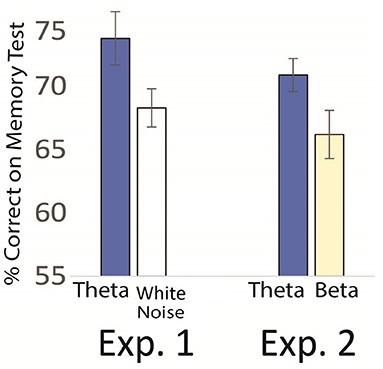 Vores første eksperiment viste, at den gruppe, der fik theta-stimulering, havde bedre hukommelse end den gruppe, der fik tilfældig støj (figur 2). Det tyder på, at audiovisuel stimulation i theta-området forbedrer hukommelsen. Men hvordan kan vi vide, at det var theta-stimuleringen, der gjorde forskellen? Det var her, vores andet eksperiment kom ind i billedet. Vi ville se, om hukommelsen blev bedre, når beta-bølgerne blev boostet, eller om effekten var specifik for theta-gruppen. Resultaterne af dette andet eksperiment viste, at kun den gruppe, der fik theta-boost, viste forbedringer i hukommelsen: den gruppe, der fik beta-stimulering, viste ingen hukommelsesforbedring (figur 2).
