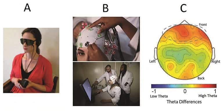 Der blev udført to eksperimenter for at se, om boosting af theta-bølger ville forbedre hukommelsen. Det første eksperiment sammenlignede et boost af theta-bølger med et boost af tilfældige mønstre, kaldet white noise. Det andet sammenlignede boosting af theta-bølger med boosting af beta-bølger. I begge eksperimenter studerede folk først en liste med 200 ord, ét ad gangen. Senere blev de udsat for en hukommelsestest, hvor de samme ord blev blandet med 100 nye ord. Efterhånden som ordene dukkede op foran dem et ad gangen, blev deltagerne bedt om at huske, om hvert ord var blevet studeret i den første del af eksperimentet. Mellem indlæringen og hukommelsestesten var der en 36-minutters periode med audiovisuel inddragelse ved hjælp af hovedtelefoner og briller som beskrevet ovenfor (figur 1). Brillerne blokerede for alt undtagen det flimrende lys, og hovedtelefonerne blokerede for alle lyde undtagen dem, der blev præsenteret. Vi kunne kontrollere lydens volumen og lysets lysstyrke. Typen af audiovisuel stimulering afhang af den gruppe, folk var blevet tildelt – deltagerne så og hørte enten theta-, beta- eller tilfældige mønstre.