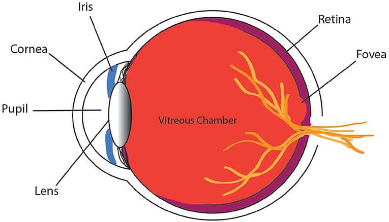 Når lyset kommer ind i øjnene, passerer det først gennem hornhinden, som er den klare kuppel på forsiden af øjnene (se figur 2). Lyset kommer derefter ind i pupillen – den mørke åbning i midten af øjet – og bevæger sig ind i linsen, en del af øjet, der hjælper med at fokusere lyset korrekt. Til sidst passerer lyset gennem den vigtigste del af det indre øje, som kaldes glaslegemet. Dette kammer er fyldt med en gellignende substans, der kaldes glaslegeme. Lys, der passerer gennem glaslegemet, fokuseres på nethinden som et klart billede. Fotoreceptorerne på nethinden omdanner lyset til neurale beskeder, som hjernen forstår.