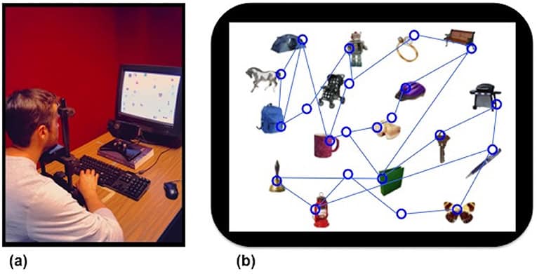 På grund af det tætte forhold mellem øjenbevægelser og opmærksomhed bruger folk, der vil studere, hvordan opmærksomhed fungerer, ofte eyetracking. En butiksejer, der gerne vil vide, hvor han skal placere sine varer, kan f.eks. bruge eyetracking til at finde ud af, hvilke områder folk oftest kigger på, når de handler. En anden anvendelse af eyetracking er at undersøge, hvordan folk leder efter specifikke objekter i deres omgivelser – dette forskningsområde kaldes visuel søgning. I eksperimenter med visuel søgning får deltagerne et mål (et specifikt billede), som de skal lede efter blandt andre distraherende billeder. Hvis du nogensinde har spillet Hvor er Waldo, ledt efter et forsvundet stykke legetøj på dit værelse eller hjulpet dine forældre med at finde deres nøgler, har du udført visuel søgning. Ved at bruge eyetrackere til at studere visuel søgning kan forskere undersøge, hvordan folk vælger, hvad de skal være opmærksomme på, når de leder efter et mål (se figur 3B).