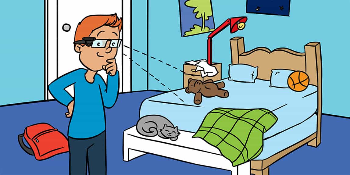 Et andet område i hjernen, kaldet de frontale øjenfelter, er vigtigt for at hjælpe dig med at bevæge dine øjne mod et område, som du bevidst vælger at se på [3]. Denne del af hjernen laver en plan for øjnene, så de ved, hvordan og hvor de skal bevæge sig, baseret på dine mål og de visuelle træk ved objekter i dine omgivelser. Et visuelt træk er noget, der beskriver et objekt, f.eks. form, størrelse eller farve. Du kan tænke på de frontale øjenfelter som en korttegner. Dette område af hjernen kortlægger de visuelle træk i dine omgivelser, og hvor vigtige eller bemærkelsesværdige de er. Hvis du leder efter et rundt ur, markerer de frontale øjenfelter runde former som vigtige. Det kan også markere et område som vigtigt, hvis det er meget opsigtsvækkende, som f.eks. et lyserødt kaffekrus på et kedeligt, brunt bord. Det område på kortet, som anses for at være vigtigst, er det næste sted, dine øjne vil bevæge sig hen. Nu hvor du ved lidt om, hvordan øjenbevægelser fungerer, så lad os se på, hvordan og hvorfor forskere studerer øjenbevægelser.