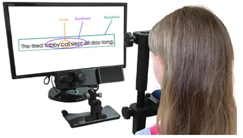 Øjenbevægelser måles med eyetrackere, som er specielle videokameraer. Eye-tracking-kameraet placeres på bordet foran læseren, lige under en computerskærm (figur 1). Der bruges ofte hage- og pandestøtter til at holde læserens hoved så stille som muligt. Eyetracking-videokameraet tager 1.000-2.000 billeder af øjet hvert sekund. Computeren finder hurtigt refleksioner af lys i læserens øje for at finde ud af, hvor personen kigger hen og hvor længe. Eye trackere er meget præcise. De ved, hvor læseren kigger hen med et bogstavs eller to nøjagtighed. De kan også måle, hvor længe en læser kigger på et ord, med nogle få tusindedele af et sekund.