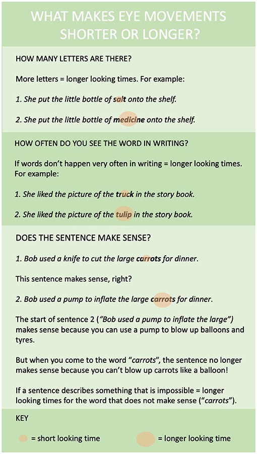 Fordi øjenbevægelser er så gode til at fortælle forskere, hvornår læsning bliver vanskelig, kan vi ændre dele af en skrevet tekst for at udforske årsagerne til, at det kan være let eller svært at læse ord og sætninger. Figur 2 giver nogle eksempler på ting, der gør øjenbevægelserne kortere eller længere.