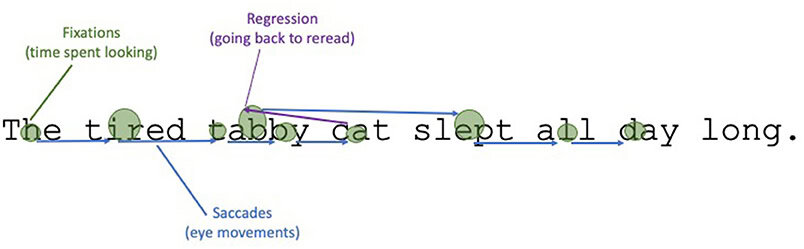 En læsers øje bevæger sig normalt fremad gennem en sætning. På engelsk betyder det, at øjnene bevæger sig fra venstre mod højre. På arabisk, som skrives med ordene fra højre mod venstre, bevæger øjnene sig fra højre mod venstre. Nogle gange bevæger øjnene sig baglæns gennem en sætning. At bevæge sig baglæns gennem en sætning giver læseren mulighed for at se på de ord, han eller hun allerede har passeret. Disse baglæns øjenbevægelser kaldes regressions. At “regrediere” betyder at gå tilbage. Baglæns øjenbevægelser sker omkring 10-15% af tiden. Forskere mener, at de sker, når læseren ikke forstår et ord eller en sætning første gang, så de ser tilbage for at genlæse det svære stykke. Genlæsning fortæller forskerne, hvor de svære ord er.
