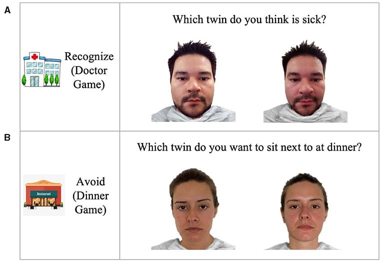I lægespillet (figur 1A) viste vi børnene billeder af en syg person ved siden af en rask person. Vi forklarede, at disse to ansigter var fra tvillinger. Vi fortalte ikke deltagerne, at ansigterne faktisk var billeder af den samme person. Vi ville sikre os, at deltagerne kiggede på ansigterne i stedet for andre dele af billederne, så vi gav alle de samme skjorter på og slettede baggrunden. Derefter spurgte vi deltagerne: “Hvilken tvilling tror du er syg?”. Det hjalp os med at teste, om deltagerne kunne udpege den syge person.