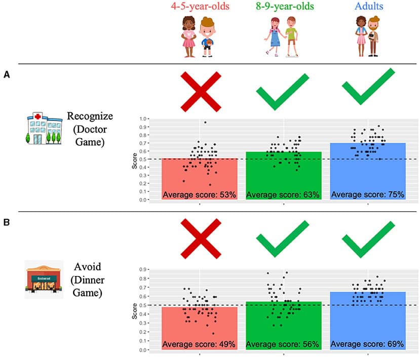 I middagsspillet (figur 1B) viste vi vores deltagere de samme billeder af de syge og de raske mennesker og spurgte dem: “Hvilken tvilling vil du sidde ved siden af til middag?”. Det hjalp os med at se, om deltagerne ønskede at gå tæt på eller holde sig væk fra de syge mennesker. Vi fandt ud af, at ældre børn og voksne gerne ville sidde ved siden af raske mennesker og undgå syge mennesker. Men yngre børn var lige tilbøjelige til at sidde ved siden af syge og raske mennesker (figur 2B). I gennemsnit var ældre børn 56% nøjagtige og voksne 69% nøjagtige, men yngre børn var kun 49% nøjagtige.
