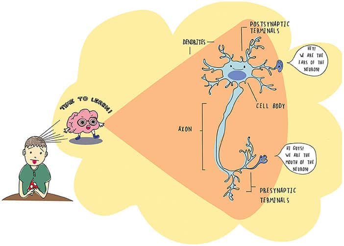 For at forstå læring er vi nødt til at træde et skridt tilbage og tale om neuroner og deres struktur. Der findes mange slags neuroner, men de har alle visse dele til fælles (figur 1). For eksempel har alle neuroner en hoveddel, der kaldes cellekroppen. Neuroner har også dendritter,som er korte, trælignende “grene”. Enderne af dendritgrenene har små fremspring kaldet post-synaptiske terminaler. Disse er neuronernes “ører” – de gør det muligt for neuronerne at modtage beskeder. Hver neuron har også en axon, som er en lang, rørlignende fiber, der kan være op til 2 meter lang (ca. 6 fod). For enden af axonet er der små strukturer, der kaldes præ-synaptiske terminaler. De er som “munden” på en neuron – de kommunikerer beskeder til andre neuroner i nærheden.