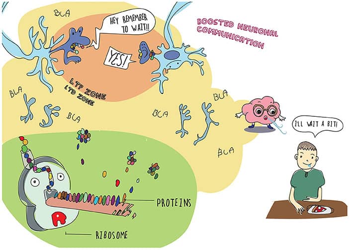 Når de har talt med hinanden længe nok, begynder neuronerne at registrere og organisere den relevante information, der er indsamlet gennem kommunikationen, og omdanne den til en hukommelse. På dette tidspunkt bliver synapserne stabiliseret, hvilket betyder, at de fokuserede neuroner, der var i stand til at kommunikere tydeligt efter mange års øvelse, styrkes og forbliver aktive, mens neuroner, der ikke taler tydeligt, udelukkes fra denne samtale. Processen med at stabilisere nye synapser kaldes langtidspotentiering(LTP). Samtidig bliver det lettere at fokusere og ignorere baggrundsstøjen. De postsynaptiske terminaler, hvis opgave det var at lytte til denne baggrundsstøj, bliver mindre og forbliver sådan. Denne proces kaldes long-term depression (LTD). Disse processer koordineres af proteiner, der har til opgave at holde synapsen stabil. De fleste proteiner produceres i neuronernes cellekrop, hvor de specialiserede proteinproduktionsfabrikker kaldet ribosomer er placeret (figur 3). Men under hukommelsesdannelsen er der brug for proteiner i de fokuserede synapser. Interessant nok har forskere taget fotografier af dendritter, der viser, at de har proteinfabrikker der såvel som i cellekroppen. Det betyder, at de specialiserede proteiner, der hjælper os med at danne hukommelse, er klar til at blive leveret, når og hvor der er brug for dem [1, 2].
