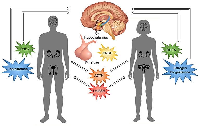 Androgener er en gruppe hormoner, der ofte forbindes med mandlige egenskaber, men de er også afgørende for kvinders korrekte udvikling. Mens mænd oplever en stor stigning i androgenet testosteron i puberteten, stiger testosteron også hos kvinder, men mindre end hos mænd. Som følge heraf organiseres hjernens kredsløb på kønsspecifikke måder, hvilket gør kvinders og mænds hjerner lidt forskellige. Dette omfatter forskelle i vækst, overlevelse og celletype i flere hjerneområder. Disse subtile forskelle, kaldet seksuelle dimorfismer forberede vores hjerner på de unikke biologiske krav, som begge køn stiller [3].