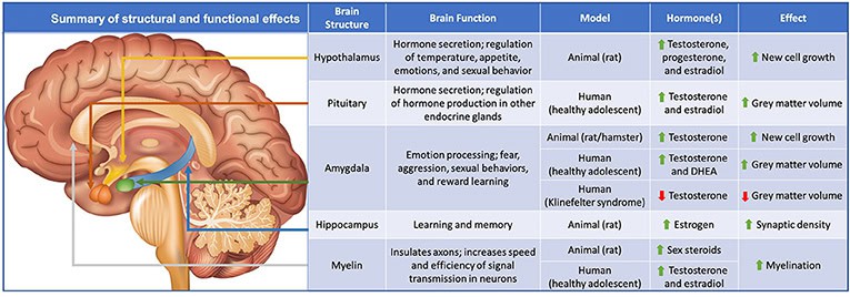 Der er flere måder, hvorpå hjernens struktur kan ændres. Den ene er vækst eller død af neuroner, som ændrer den samlede størrelse af hjernens regioner. Hos dyr og sunde mennesker er pubertetshormoner nødvendige for korrekt vækst af hjernestrukturer som hypothalamus, hypofysen og amygdala. Da hypothalamus og hypofysen er afgørende for livslang hormonregulering, kan forkert vækst af disse hjerneområder i puberteten føre til langsigtede sundhedsmæssige konsekvenser, såsom forstyrrelser i søvn eller stofskifte. Klinefelters syndrom, som er en genetisk lidelse forårsaget af et ekstra X-kromosom, fører til mangel på testosteron og en markant reduceret amygdala-volumen i ungdomsårene. Disse hormonelle og hjernestrukturelle ændringer kan bidrage til de sociale og følelsesmæssige problemer, som disse personer står over for, herunder social angst og vanskeligheder med at udtrykke følelser.