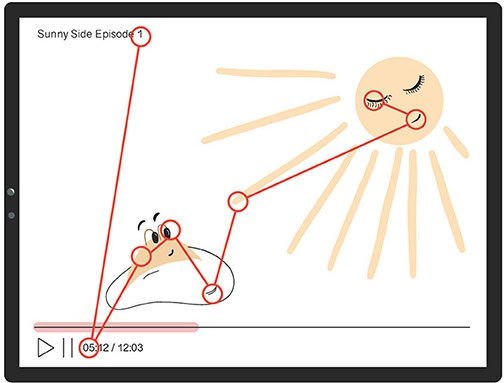 Hvis en eyetracker registrerede dine øjenbevægelser, mens du så en video, kunne en forsker bruge dine øjenbevægelser til at forstå, hvad du var opmærksom på på skærmen og i hvor lang tid. For eksempel kunne en eyetracker registrere dine fikseringer: når det ser ud, som om dine øjne er holdt op med at bevæge sig for at se på noget. Længere fikseringer (som når du stirrer på noget) kan betyde, at du virkelig er fokuseret på en karakter i videoen, mens kortere og hyppige fikseringer kan betyde, at du enten er distraheret af andre karakterer eller objekter, eller at du har problemer med at forstå, hvad der sker på skærmen. Trackeren kan også registrere, at dine øjne følger figurernes bevægelser, uden at du selv lægger mærke til det (figur 1). De store, fejende bevægelser, som dine øjne foretager mellem fikseringer, kaldes saccades (For mere information om øjenbevægelser, se denne Frontiers for Young Minds artikel).