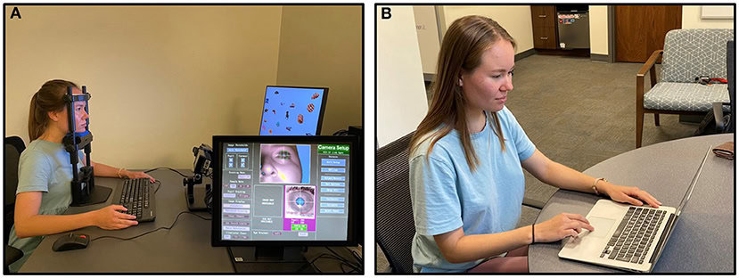 Eyetracking-systemet bruger en masse teknisk udstyr og kræver, at deltageren holder hovedet stille på en hagestøtte. Alt dette udstyr gør, at systemet meget nøjagtigt kan finde ud af, hvor deltageren kigger hen på computerskærmen. (B) En person arbejder på en bærbar computer med indbygget webkamera. Webkameraet kræver ikke så meget udstyr, og deltageren kan sidde behageligt og kan frit bevæge hovedet.