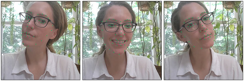 Prikkerne (pejlemærkerne) på denne kvindes ansigt er på vigtige kanter og hjørner af ansigtet, såsom hendes kæbe, mund, øjenbryn og ikke mindst hendes øjne. Maskinlæring kan bruge pejlemærker til at lave bedre forudsigelser af blikkets placering ud fra webcam-billeder som disse.