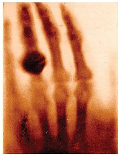 Det medicinske område, der fokuserer på at optage og analysere billeder af hjernen og alle dele af kroppen, kaldes radiologi. Navnet radiologi kommer fra den første type “kamera” eller teknologi, der blev brugt til at tage disse billeder, kaldet røntgenmaskinen, som bruger stråling. Ordet radiologi stammer fra orddelene “radio”, som står for stråling, og “ologi”, som er et græsk suffiks, der betyder videnskabelig undersøgelse af noget. Opfindelsen af røntgenstrålen tilskrives den tyske maskiningeniør Wilhelm Conrad Röntgen, som i 1895 genererede og detekterede den elektromagnetiske stråling, der blev grundlaget for den røntgenteknologi, vi stadig bruger i dag. I figur 1 kan du se knoglerne i Röntgens kones hånd, som menes at være det første røntgenbillede af en menneskelig kropsdel. Du kan se de forskellige fingerknogler, kaldet falanger, og en mørk klat på ringfingeren, som er hendes vielsesring. Hvis du nogensinde har brækket en knogle, har du sandsynligvis fået taget et røntgenbillede for at fastslå, hvor bruddet opstod.