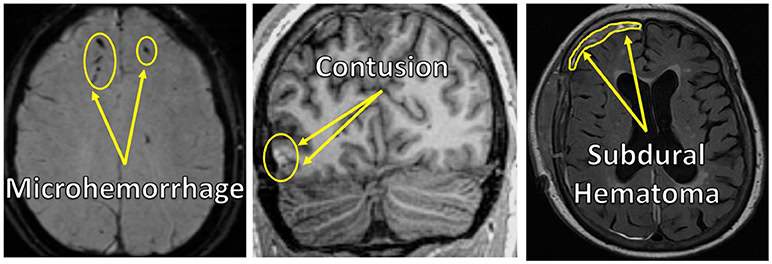 En anden almindelig hjerneskade kaldes en kontusion (se pilene, der peger på den lyse plet nederst til venstre i midterpanelet i figur 3), som er et blåt mærke på hjernen på grund af et traume. Ligesom blå mærker, man får på armen eller benet efter et fald, omfatter en hjernekontusion ofte en samling af blødninger i et lokaliseret område. I modsætning til et blåt mærke på armen eller benet, som heler med tiden og ikke efterlader mærker efter skaden, kan hjernekontusioner og skaden på det omkringliggende hjernevæv være mere permanent. Ved at se ind i hjernen ved hjælp af CT- eller MR-scanning kan lægerne visualisere hjernekontusioner, hvilket hjælper lægerne med at afgøre, hvordan de bedst kan diagnosticere, behandle og pleje patienter med traumatisk hjerneskade.