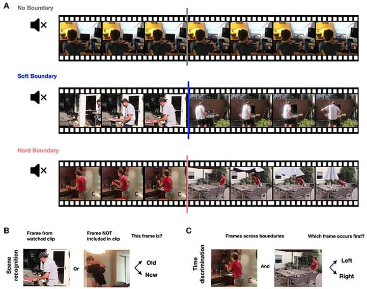 Mens vi overvågede deres neurale signaler, udførte deltagerne et hukommelseseksperiment (figur 2). De så 90 tavse videoklip, der indeholdt forskellige slags grænser. Klip uden grænser indeholdt kontinuerlige optagelser uden nogen form for redigering. Klip med bløde og hårde grænser indeholdt begge sceneovergange, som du sikkert har set mellem scener i film. Bløde grænser klipper til en relateret scene, men hårde grænser klipper til en helt urelateret scene. For eksempel er en scene med en person, der griller, og som skifter fra et sidebillede til et bagfra-billede, en blød grænse, mens en scene, der skifter fra at lave kaffe til at folde en paraply sammen, er en hård grænse (figur 2A).