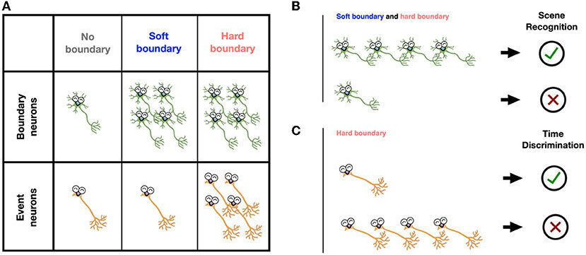 Er hjernen opmærksom på disse forskellige grænser, når den ser et klip? Helt sikkert! Vi fandt ud af, at to grupper af neuroner hjalp med at identificere forskellige slags begivenhedsgrænser (figur 3A). Grænse-neuroner aktiveres meget, når deltagerne ser videoklip af både bløde og hårde grænser, mens event neurons aktiveres kun meget ved hårde grænser. Begge typer neuroner er primært placeret i hippocampus et hjerneområde, der er ansvarligt for at skabe nye erindringer.