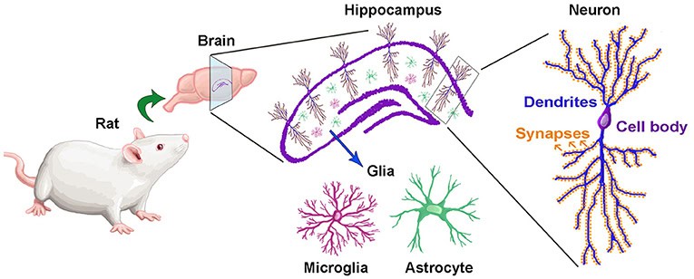 Vidste du, at vores hjerner indeholder højt specialiserede regioner til at udføre forskellige opgaver? Der er f.eks. forskellige områder i hjernen til at tale, gå, høre osv. En af disse meget specialiserede regioner, kendt som hippocampus hippocampus er ansvarlig for at lagre minder og hjælpe os med at lære [3]. Hippocampus består ligesom alle andre områder i hjernen af to hovedtyper af celler: neuroner og gliaceller. Neuroner i hippocampus skaber hukommelse ved at kommunikere med hinanden gennem meget små strukturer kaldet synapser; disse små strukturer er placeret på lange, grenlignende strukturer kaldet dendritter. Vidste du, at neuroner kan sende elektriske signaler, ligesom de elektriske ledninger, du ser langs gaden? Disse signaler sendes gennem dendritterne, og det gør det muligt for beskederne i hjernen at bevæge sig meget hurtigt. De andre typer celler i hjernen, gliacellerne, har flere funktioner. Gliaceller nærer, beskytter og giver stabilitet til neuroner. I hippocampus er både neuroner og gliaceller afgørende for at lagre minder og hjælpe os med at lære (figur 1).