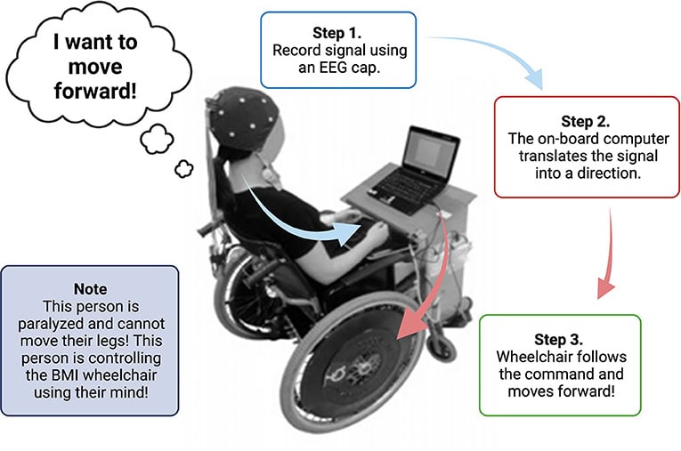 Efter at have registreret hjernesignaler med elektroderne, oversætter BMI disse signaler til instruktioner til kørestolen. Computeren lærer formen af hjernesignaler, der er relateret til forskellige retninger, lidt ligesom at lære et nyt sprog. Det tager dog tid at lære dette nye sprog, så computeren skal studere hjernesignalerne for at lave korrekte oversættelser. Når BMI’en har lært at oversætte signalet, kan den bestemme, hvilken retning brugeren ønsker at bevæge sig i. Elektriske kørestole er ikke de eneste enheder, der kan styres med en BMI. BMI’er kan styre en musemarkør på en computerskærm, og de kan lukke hånden på en robotarm.