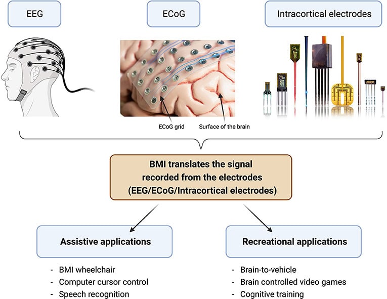 Hvordan ved en BMI, hvilken retning du ønsker at bevæge din elektriske kørestol i? Din hjerne tænker “kør fremad”, men hvordan læser BMI’en dine tanker? Neuronerne i din hjerne taler sammen, når du tænker på at køre kørestolen fremad, så det første skridt er at registrere disse hjernesignaler. Vi kan optage hjernesignaler ved hjælp af elektroder, som er apparater, der opsamler elektriske signaler. For eksempel bærer personen i figur 1 en særlig type elektrodeholdig kasket, der kaldes en elektroencefalografi (EEG), kasket. En anden type elektrode, kaldet en elektrokortikografi (EKoG) gitter, placeres direkte på hjernens overflade. En kirurg skal fjerne kraniet for at placere EKG-gitteret, men det trænger ikke ind i hjernen – det sidder bare på overfladen. I modsætning hertil er intrakortikale (dvs. inde i hjernen) placeres elektroder, der ligner meget små nåle, dybt i hjernevævet, også gennem kirurgi. De kan registrere meget detaljeret neural aktivitet. Figur 2 viser disse tre typer elektroder [1].