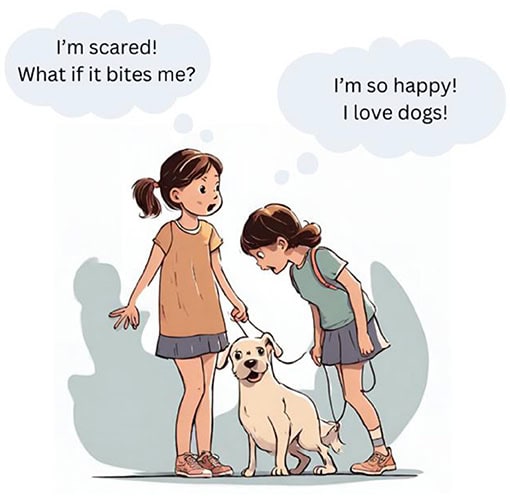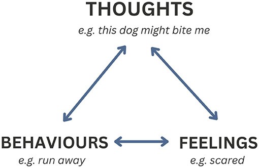 Forestil dig for eksempel, at du ser en hund, mens du går ned ad gaden (figur 1). Hvis du synes, at hunden ser skræmmende ud og måske bider dig, kan den tanke få dig til at føle dig ængstelig eller bange. Så krydser du måske vejen eller løber væk fra hunden – det er dine handlinger. På den anden side kan en anden se den samme hund og synes, at den ser venlig ud. Den tanke kan få dem til at føle sig begejstrede, og deres handling kan være at gå hen til hunden og bede om at klappe den.