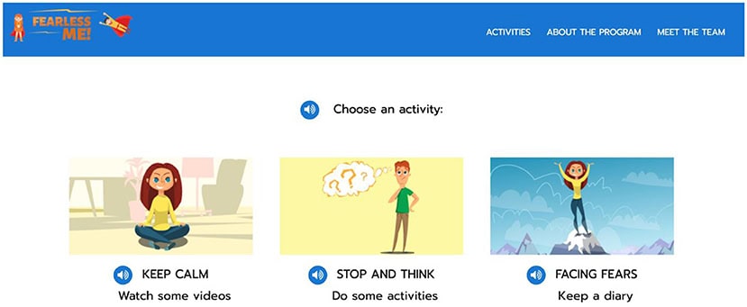 Ud fra alle disse oplysninger skabte vi Fearless Me! programmet [5]. Fearless Me! blev skabt specielt til børn med intellektuelle handicap og er baseret på CBT. Fearless Me! er designet til børn i alderen 8-17 år med mild, moderat eller svær angst. Det indebærer 10 sessioner med en terapeut. Der er også en hjemmeside med sjove aktiviteter, som børnene kan lave, både med terapeuten og derhjemme.