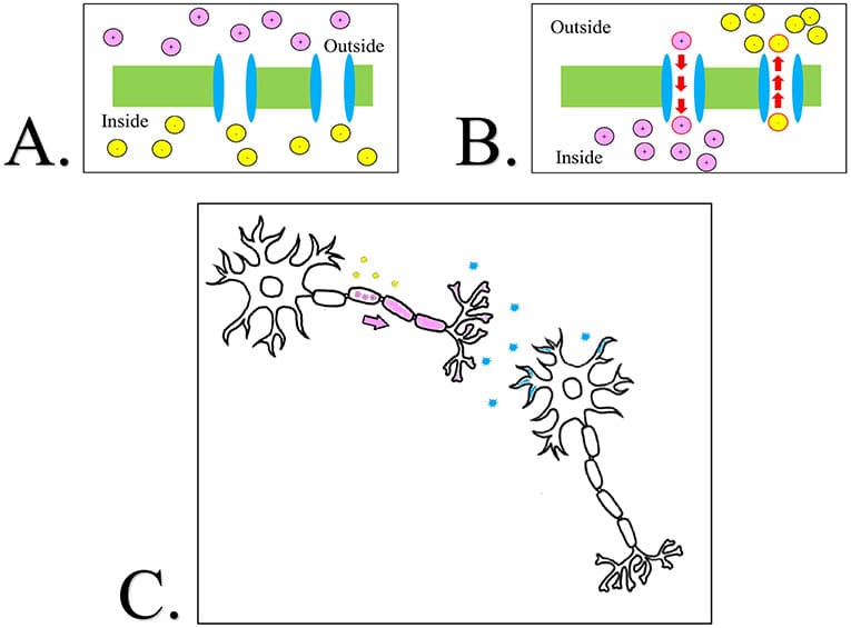 Neuroner er celler i hjernen. Neuroner bruger både elektriske ladninger og kemikalier kaldet ioner til at kommunikere med hinanden. Vi siger, at neuroner har en elektrokemisk ladning, og denne ladning ændrer sig, afhængigt af om neuronet er i hvile eller sender et signal. Inde i og mellem neuronerne er der væske, der indeholder ioner, som er atomer eller molekyler, der har en positiv eller negativ ladning. Når et neuron er i hvile, er der flere negative ioner inde i det og flere positive ioner uden for det (figur 1A), hvilket giver neuronmembranen en negativ ladning. Når der opstår hjerneaktivitet, strømmer positive ioner ind gennem kanaler i neuronmembranen (figur 1B), og når ladningen bliver høj nok, sender neuronet et signal for at kommunikere med nærliggende neuroner (figur 1C). Tænk på det som en tændstik, der skal stryges med lige præcis nok kraft; når den slår gnister, går der ild i hele tændstikken. Elektrisk stimulation i hovedbunden kan målrette den elektrokemiske aktivitet i hjernen og ændre ladningerne i neuronerne uden behov for kirurgi. Da der aldrig kun er én neuron, der skyder ad gangen, men snarere “populationer” af neuroner, der skyder, kan ændring af ladningen i væsken, der omgiver neuronpopulationer, have betydelige effekter på hjerneaktiviteten.