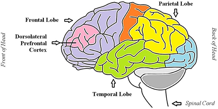 Lidt tristhed og stress er almindeligt i livet, og de fleste mennesker oplever disse følelser i sunde mængder. Men længere perioder med depression, angst og stress kan nogle gange være tegn på forstyrrelser i humørreguleringen, som går hårdt ud over det mentale (og fysiske) helbred. Ferrucci et al [2] brugte tDCS til at reducere symptomerne på en meget almindelig humørreguleringsforstyrrelse, kendt som major depressive disorder (MDD). Denne lidelse er forbundet med vedvarende følelser af tristhed, lavt energiniveau, ændringer i appetitten og tab af interesse for aktiviteter. Disse symptomer er langvarige og menes at være forårsaget af en ubalance i hjernens aktivitet. Scanninger af hjernen viser lavere neuronal aktivitet end normalt i et område i den forreste del af hjernen kaldet venstre dorsolaterale præfrontale cortex (DLPFC; se figur 3) og nogle gange højere neuronal aktivitet end normalt i højre DLPFC. DLPFC har forbindelser til følelsesområder, der ligger dybere i hjernen, og spiller derfor en vigtig rolle i at kontrollere humøret. I denne undersøgelse udfyldte deltagere med svær depression først spørgeskemaer for at vurdere deres humør. Derefter blev deltagerne i 5 dage i træk stimuleret i venstre DLPFC i 20 minutter, to gange hver dag. Deltagerne udfyldte spørgeskemaerne om humør igen umiddelbart efter tDCS, og de fleste viste forbedringer på dem alle! Selv da de blev testet en måned senere, viste deltagerne stadig færre symptomer på tristhed og depression.