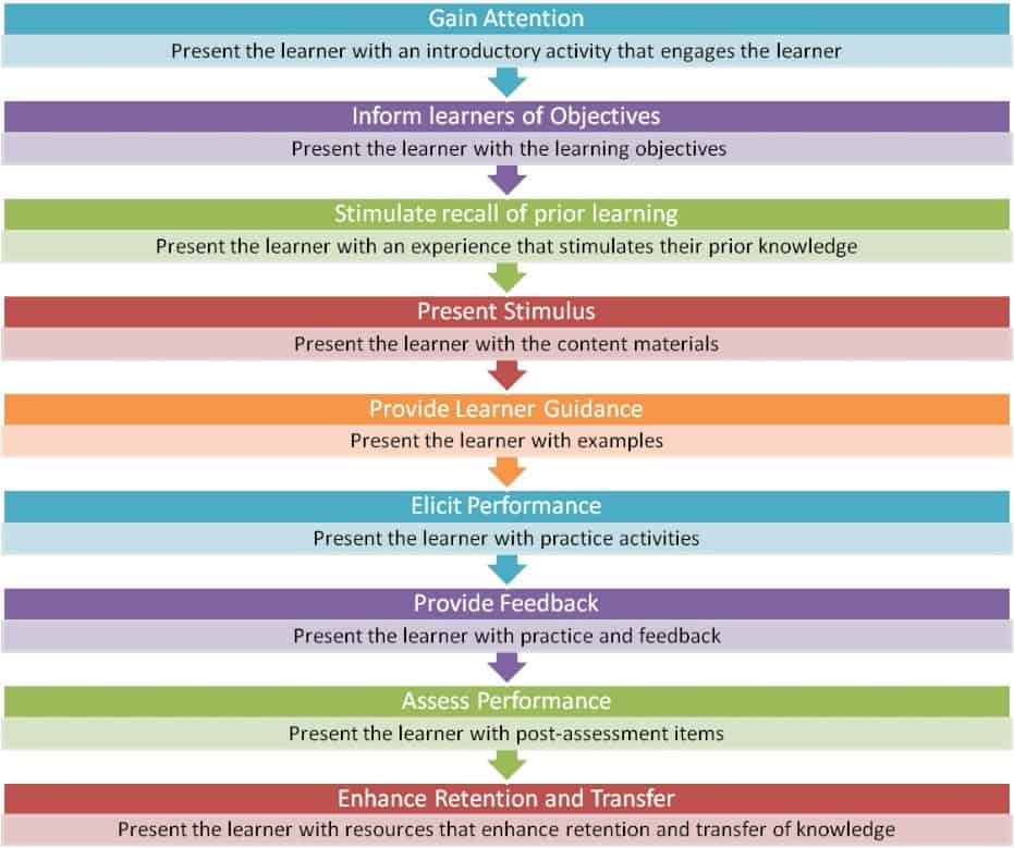 Gagne foreslog at instruktion begynder med en fase af forventning (motivation for at lære) fortsætter til opfattelse og overtagelse gennem fastholdelse, genkaldelse og generalisering til præstation og feedback. I denne sammenhæng betragter han instruktøren som designer og lederen af læringsprocessen og evaluator af udbyttet.