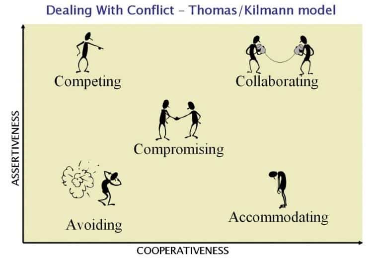 Thomas og Kilmann foreslog fem tilgange, der kan anvendes I løsningen af en konflikt mellem to parter. I deres model har de kategoriseret konsekvensen af hver tilgang i forhold til graden selvsikkerhed (assertiveness) og graden af samarbejde (cooperation) som mulige vind-tab udfald. De argumenterede for at, hvis man forstod konsekvensen af de forskellige tilgange, vil det være muligt at vælge, hvilken man vil anvende i en konflikt.