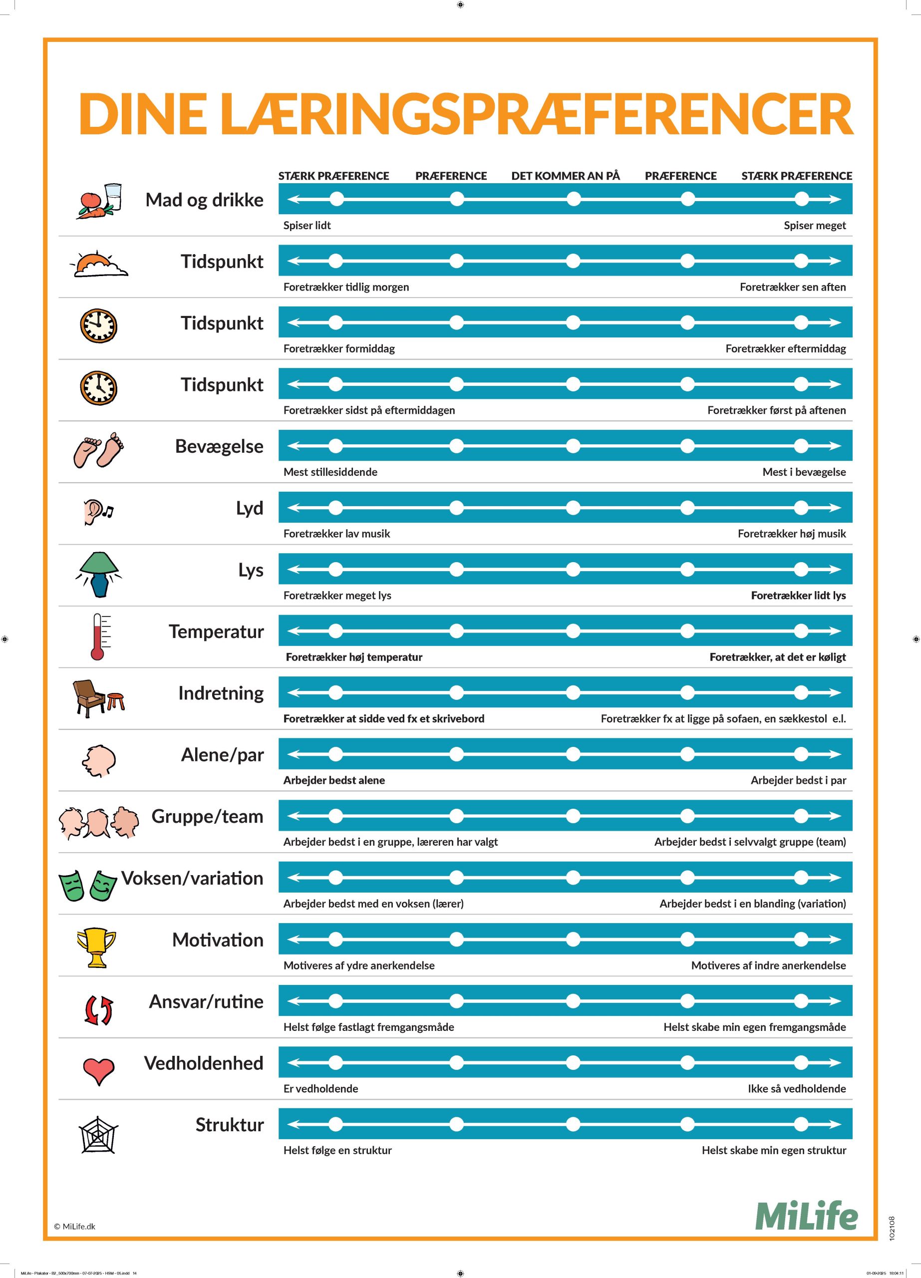 Plakaten “Dine læringspræferencer” er et pædagogisk værktøj og et inspirerende undervisningsmateriale, der giver et klart visuelt overblik over de mange forskellige faktorer, som påvirker elevers læring og trivsel. Den hjælper både elever og lærere med at identificere, hvordan den enkelte lærer bedst – og skaber en naturlig indgang til differentieret undervisning og samtaler om elevmotivation og læringsmiljø.